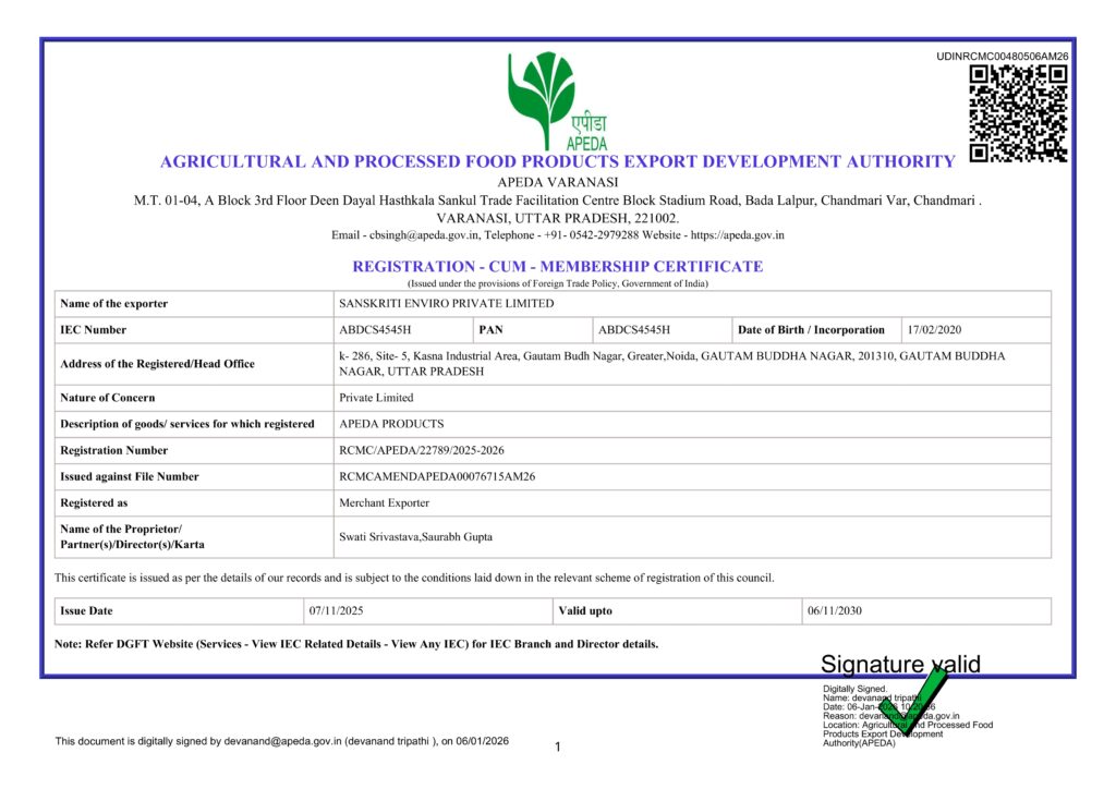 When you source from Sanskriti Enviro, you aren’t just buying from an agro-exporter. You are partnering with a resource management specialist dedicated to delivering pesticide-free products with a measurable reduction in water and carbon footprints.